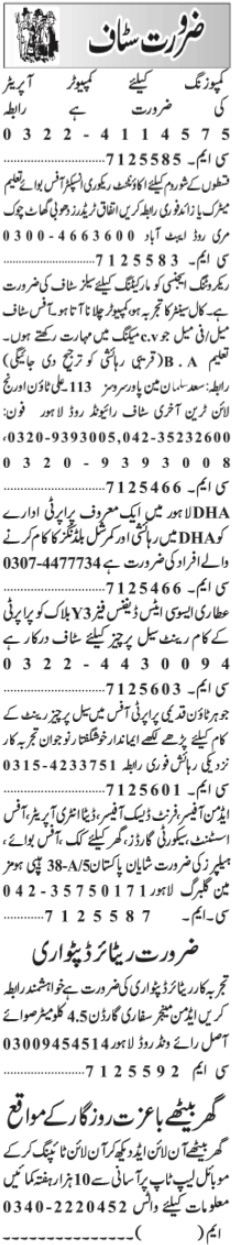 Vacant posts including composer, cook, deo, helper, security guard, admin officer, office boy, purchaser, patwari, front desk officer, accountant, computer operator, recovery inspector, office assistant, online typist, data entry operator, marketing officer and sales officer are announced in Private Company Lahore, lahore Punjab Pakistan as per 16 November 2022 advertisement in daily Jang Newspaper. Educational qualifications required Middle, Bachelor, Matric, Master and Intermediate etc.