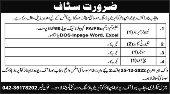 Punjab Board of Revenue Employees Cooperative Housing Society is looking for candidates for following posts as per job advertisement published in daily Roznama 92 News Newspaper of December 22, 2022 for location Lahore, lahore Punjab Pakistan: