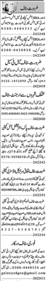 Vacant posts including soldier, call center staff, retired fauji guard, civil guard, call operator, field worker, male staff, security supervisor guard, naib subedar, seo expert, security guard, manager, clerk, office assistant, accountant, subedar major, supervisor, graphic designer, female staff, retired subedar, helper, office manager, havaldar, office boy and lance naik are announced in Private Company Lahore, lahore Punjab Pakistan as per 24 February 2024 advertisement in daily Dunya Newspaper. Educational qualifications required Middle, Matric, Bachelor, Intermediate and Master etc.