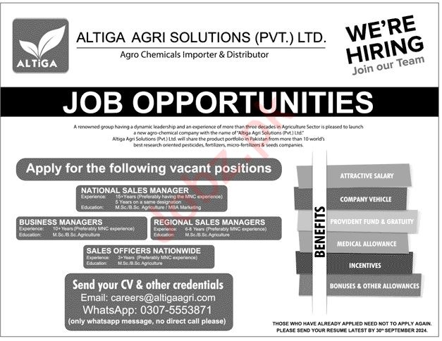 Latest Altiga Agri Solutions Private Limted Sales Posts Islamabad 2025