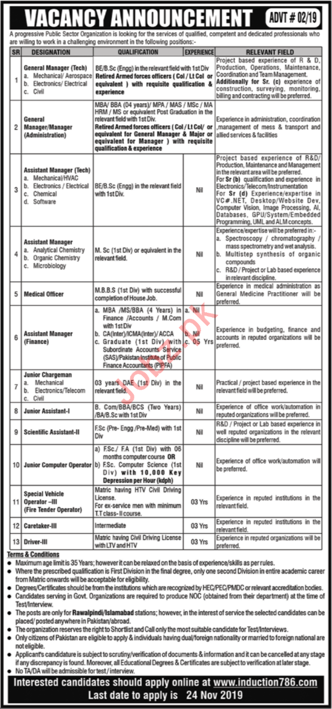 A well reputed Public Sector Sector Organization is looking for General Manager, Administration Manager, Assistant Manager, Medical Officer, Finance Manager, Chargeman, Assistant, Scientific Assistant, Computer Operator,Special Vehicle Operator, Caretaker, Driver in Islamabad.