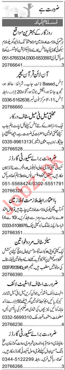 Salesman, Insurance Agent, Sales Officer, Cook, Security Guard, Watchman, Driver, Kitchen Helper, Dish Washer, Loader, Waiter, Receptionist, Supervisor, Chef, Maid, Clerk, Admin Officer, Data Entry Operator, Cashier, Manager, Sales Staff seeks in well reputed companies.