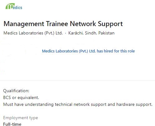 Medics Laboratories Karachi, karachi Sindh Pakistan invites applications from eligible candidates for the post of management trainee networks support as per advertisement of December 28, 2022 published in daily Other Newspaper. Preferred Education is BCS etc.