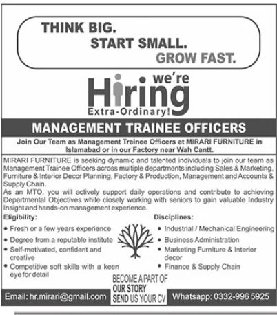 Mirari Furniture Pvt Ltd Wah Cantt, wah cantt Punjab Pakistan invites applications from eligible candidates for the post of management trainee officer as per advertisement of March 2, 2025 published in daily The News Newspaper. Preferred Education is Bachelor etc.