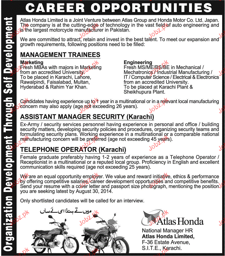 Apply as per details in job advertisement. Login to view further details of how to apply via https://www.jobz.pk online.