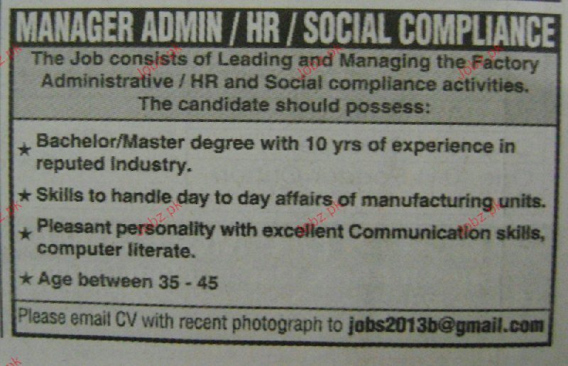 Manager Admin, Manager HR And Social Compliance Wanted