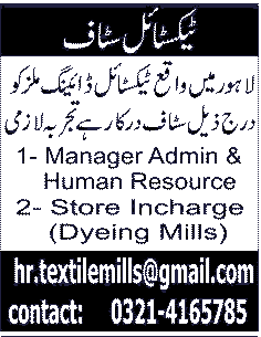 Manager Admin, Manager HR and Stoere Incharge Wanted