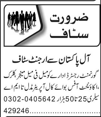Private Organization jobs advertisement dated about 20 September 2024 in daily Roznama 92 News Newspaper invites application for the vacant post of call operator, office boy, clerk, accountant and manager in Lahore, lahore Punjab Pakistan. Preferred Education is Bachelor, Master, Matric, Middle and Intermediate etc.