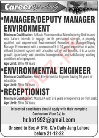 Private Company invites applications for job positions advertised in daily The News dated 11 December 2022 for following vacancies in Lahore, lahore Punjab Pakistan.