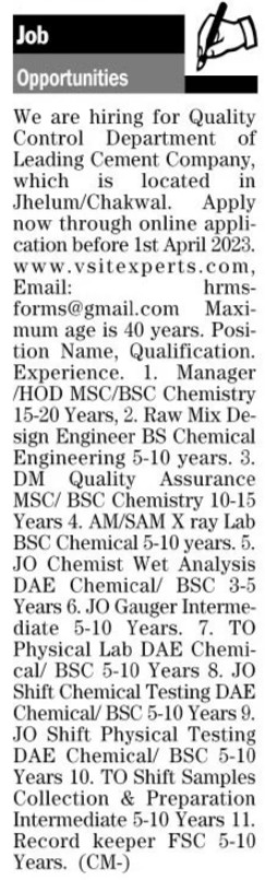 Vacant posts including record keeper, manager, jo gauger, assistant manager xray lab, raw mix design engineer, deputy manager quality assurance, jo shift physical testing, jo shift chemical testing, to shift samples collection preparation, to physical lab and jo chemist wet analysis are announced in Cement Company Jhelum, jhelum and chakwal Punjab Pakistan as per 27 March 2023 advertisement in daily The News Newspaper. Candidates with Intermediate, DAE and M.sc etc. educational background will be preferred.