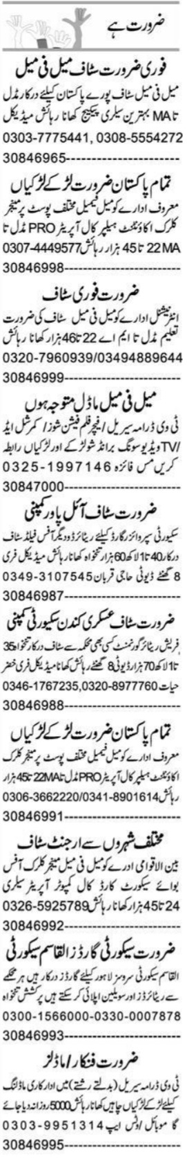 Vacant posts including office boy, male female staff, call computer operator, manager, management staff, helper, actor, clerk, field staff, model, retired government staff, security guard, pro, accountant, call operator, security supervisor, retired staff and office staff are announced in Private Faisalabad, faisalabad Punjab Pakistan as per 27 March 2023 advertisement in daily Express Newspaper. Matric, Middle, Intermediate, Bachelor and Master etc. educational qualification will be preferred.