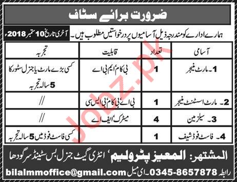 Manager, Assistant Manager, Salesman & Chef Jobs 2018