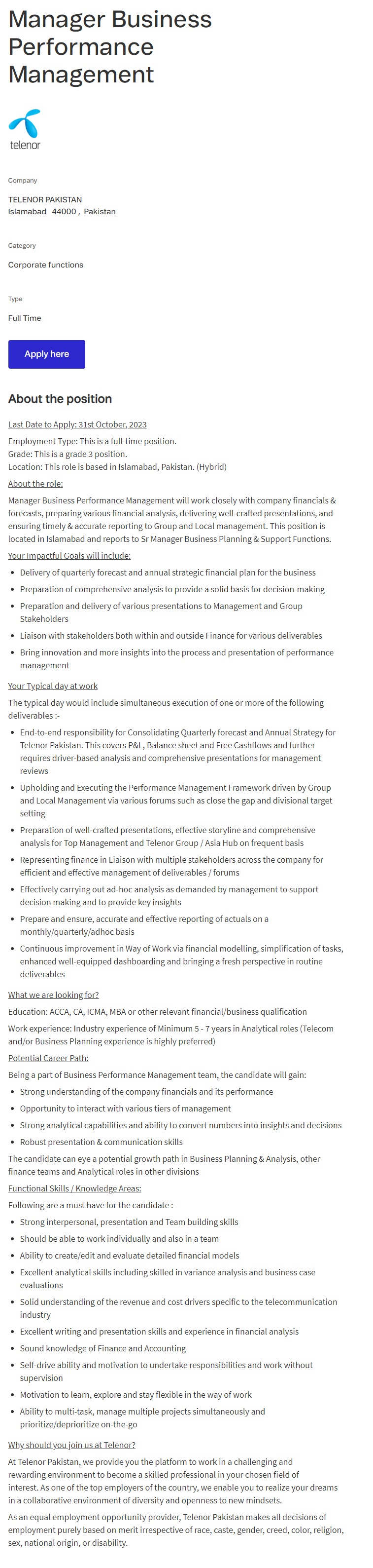 Telenor Pakistan Islamabad, islamabad Islamabad Pakistan invites applications from eligible candidates for the post of manager business performance management as per advertisement of October 24, 2023 published in daily Other Newspaper. Educational qualifications required Bachelor and Master etc.