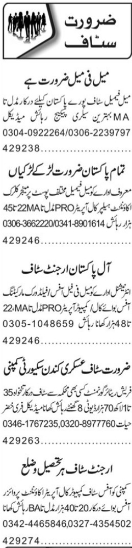 Private Company Lahore, lahore Punjab Pakistan invites applications from eligible candidates for the post of pro, accountant, public relations officer, marketing officer, computer operator, manager, office field staff, office boy, helper, clerk, female staff, male staff, call operator and supervisor as per advertisement of March 15, 2023 published in daily Roznama 92 News Newspaper. Candidates with Middle, Intermediate, Matric, Master and Bachelor etc. educational background will be preferred.