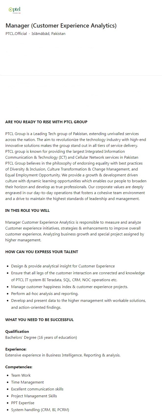 Pakistan Telecommunication Company Limited PTCL Islamabad, islamabad Islamabad Pakistan invites applications from eligible candidates for the post of manager customer experience analytics as per advertisement of December 29, 2022 published in daily Other Newspaper. Candidates with Bachelor etc. educational background will be preferred.