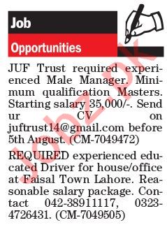 Manager & Driver Jobs Opportunity in Lahore 2018