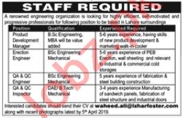 A Private company is looking for highly qualified and experienced candidates for the post of Product Development Manager, Erection Engineer, Quality Assurance Engineer, Quality Control Engineer, Quality Assurance Inspector, Quality Control Inspector in Lahore. Interested candidates can contact on given details.