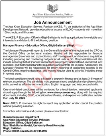 Vacant posts including manager finance are announced in Aga Khan Education Service Pakistan Gilgit, gilgit Gilgit Baltistan Pakistan as per 2 July 2023 advertisement in daily Jang Newspaper. Candidates with Bachelor and Master etc. educational background will be preferred.