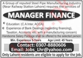Steel Pipes Manufacturing Industry Lahore, lahore Punjab Pakistan invites applications from eligible candidates for the post of manager finance as per advertisement of October 29, 2023 published in daily Jang Newspaper. Preferred Education is Bachelor and Master etc.