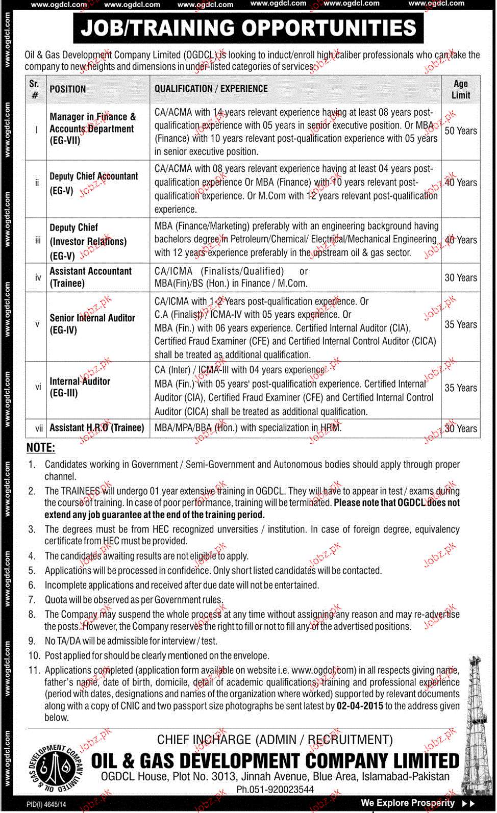 Manager Finance, Senior Internal Auditor Job In OGDCL