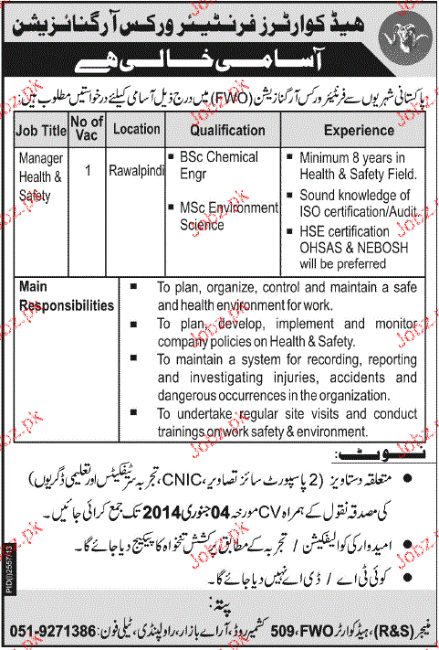 Manager Health & Safety Job In Headquarters Frontiers Works