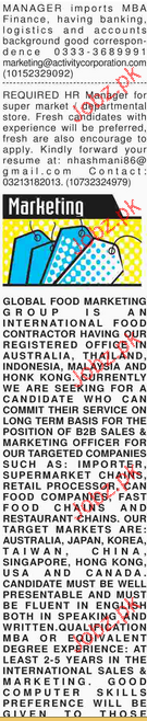 Manager Imports, Manager HR and Marketing Staff Wanted