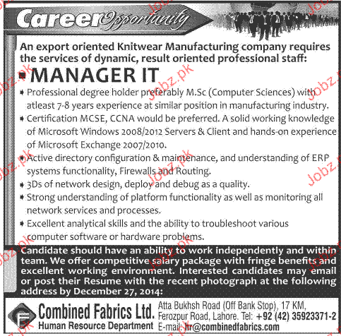 Apply as per details in job advertisement. Login to view further details of how to apply via https://www.jobz.pk online.