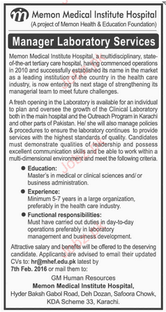 Manager Lab Job In Memon Medial Institute