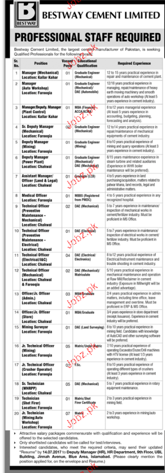 Apply as per details in job advertisement. Login to view further details of how to apply via https://www.jobz.pk online.