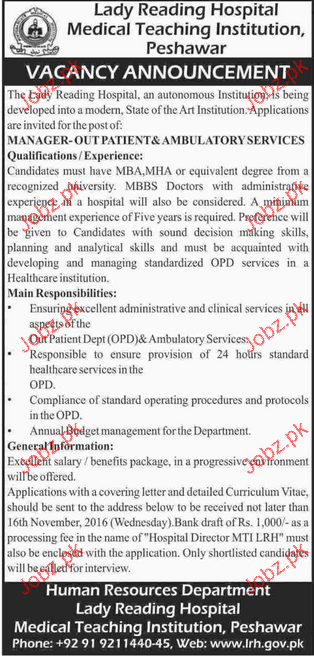 Manager Outpatient Job In Lady Reading Hospital