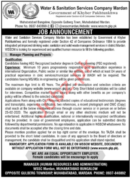 Manager Planning & Projects Jobs 2021 in WSSC Mardan