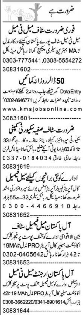 Private Company Multan, multan Punjab Pakistan invites applications from eligible candidates for the post of security guard, office boy, office staff, helper, supervisor, computer operator, data entry operator, security supervisor, pro, clerk, accountant, public relation officer, manager, call operator and female office staff as per advertisement of October 21, 2022 published in daily Express Newspaper. Persons with Bachelor, Intermediate, Middle and Matric etc. education can apply.