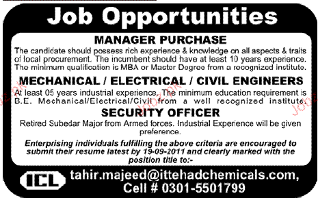 Manager Purchase, Engineers And Security Officer Required