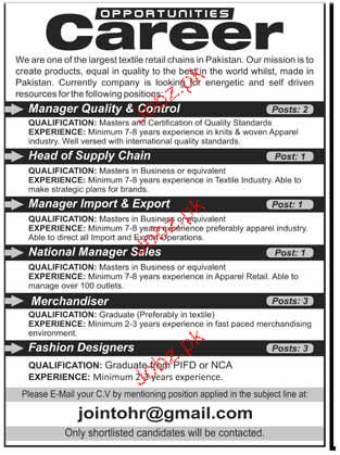 Apply as per details in job advertisement. Login to view further details of how to apply via https://www.jobz.pk online.