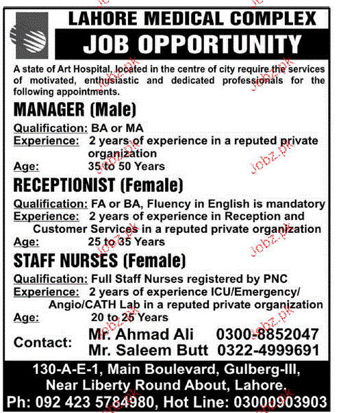 Manager, Receptionist and Staff Nurses Job Opportunity