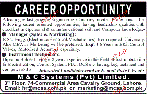 Manager Sales & Marketing And Instrument Technicians Wanted