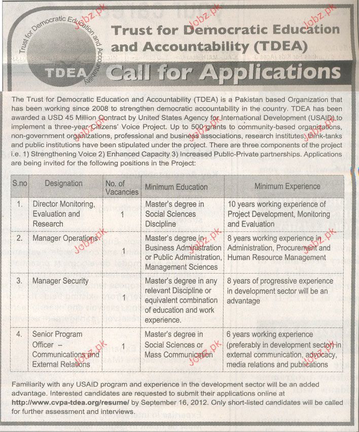 Apply as per details in job advertisement. Login to view further details of how to apply via https://www.jobz.pk online.