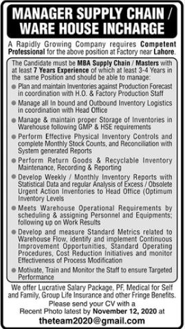 Manager Supply Chain & Warehouse Incharge Jobs 2020