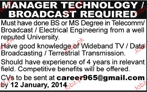 Manager Technology / Braodcast Job Opportunity