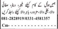 Hotel is looking for candidates for following posts as per job advertisement published in daily Jang Newspaper of August 29, 2025 for location Quetta, quetta Balochistan Pakistan: