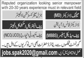 Qualified and experienced candidates for the posts of Managing Director, General Manager Construction, Engineer, Director Finance, Director Operation, Chief Electrical Engineer, Mechanical Engineer, Chief Medical Officer and Chief Security Incharge required for private organization in Islamabad.