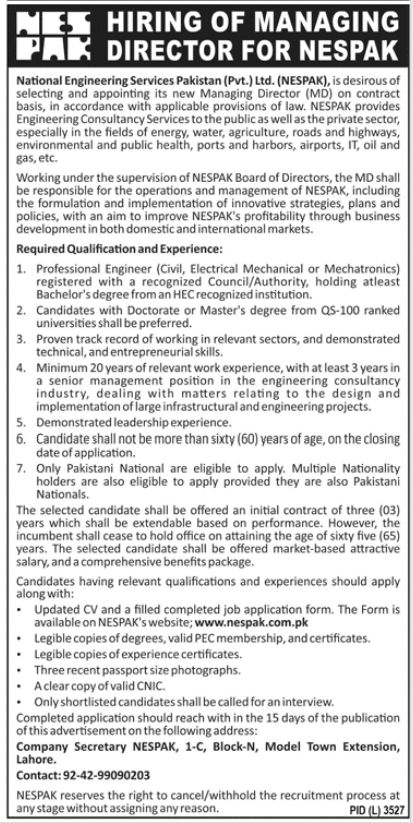 National Engineering Services Pakistan NESPAK invites applications for job positions advertised in daily Jang dated 9 June 2023 for following vacancies in Lahore, lahore Punjab Pakistan.
