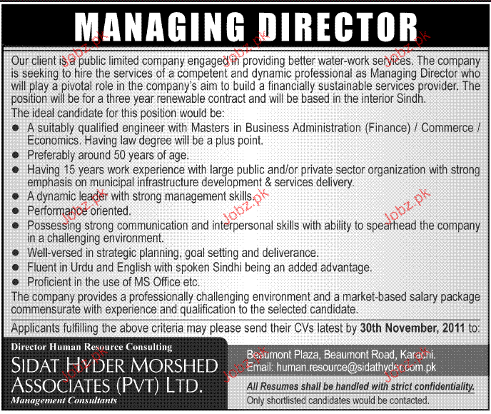 Managing Director is required in Sidat Hyder Morshed Associates Pvt Ltd in Karachi
