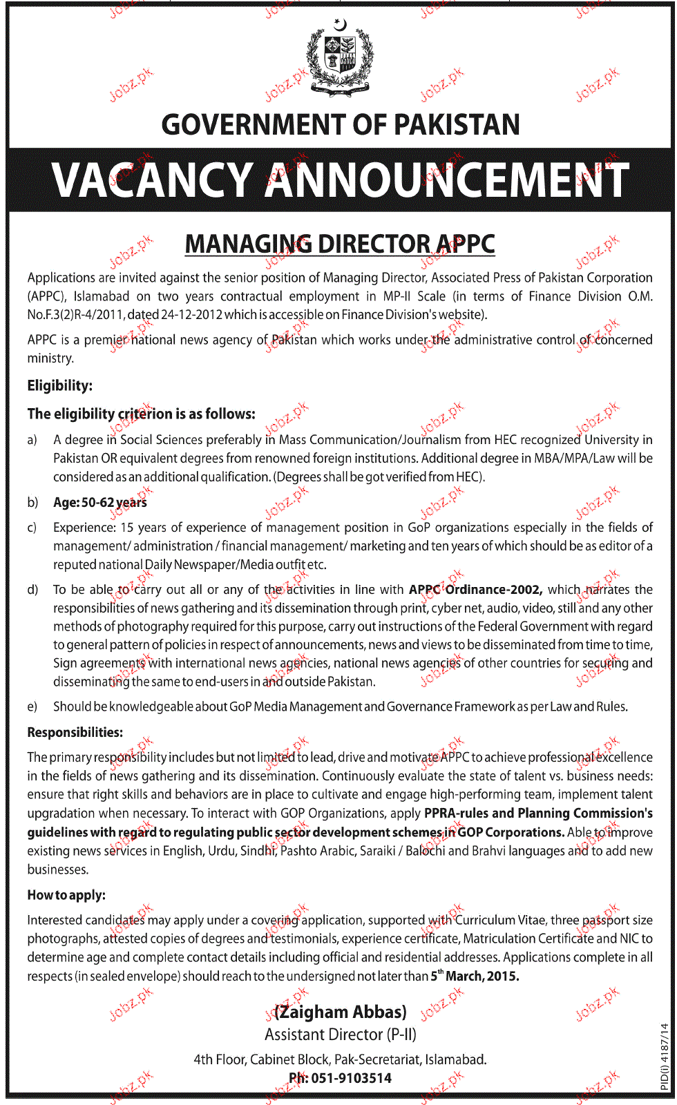 Apply as per details in job advertisement. Login to view further details of how to apply via https://www.jobz.pk online.