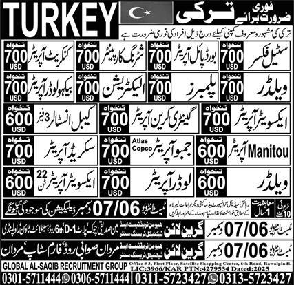 Green Line Human Trade Test & Technical Training Center Ankara, istanbul Turkey invites applications from eligible candidates for the post of plumber, excavator operator, gantry crane operator, backhoe loader operator, manitou operator, jambu operator, electrician, steel fixer, bored pile operator, cable installer, loader operator, shuttering carpenter, concrete operator, screed operator and welder as per advertisement of December 6, 2025 published in daily Express Newspaper. Bachelor, DAE, Matric, Intermediate and Others etc. educational qualification will be preferred.