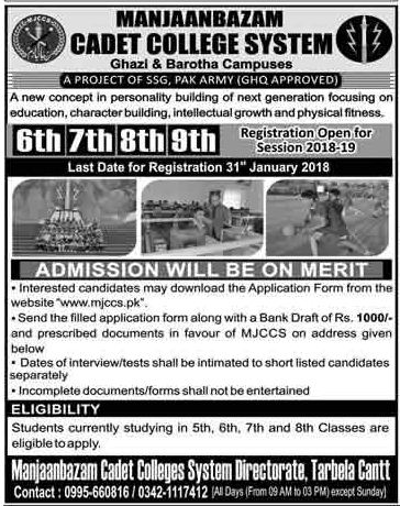 Manjaanbazam Cadet College System Tarbela Cantt, Pakistan registration open for session 2018 for the classes of 6th, 7th, 8th, 9th. Last date for submission of admission forms is 31st January 2018. Read newspaper ad for exact details.