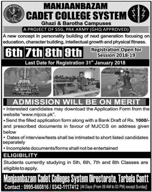 Manjanbazam Cadet College Tarbela Cantt, Pakistan start admissions session 2018-19 for the classes of 5th, 6th, 7th and 8th. New admissions process will commence from 31st January 2018. Read newspaper ad for exact details.
