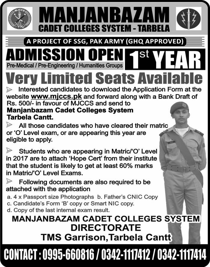 Manjanbazam Cadet College System Admission in Class XI in Tarbela. Read newspaper ad for exact details.