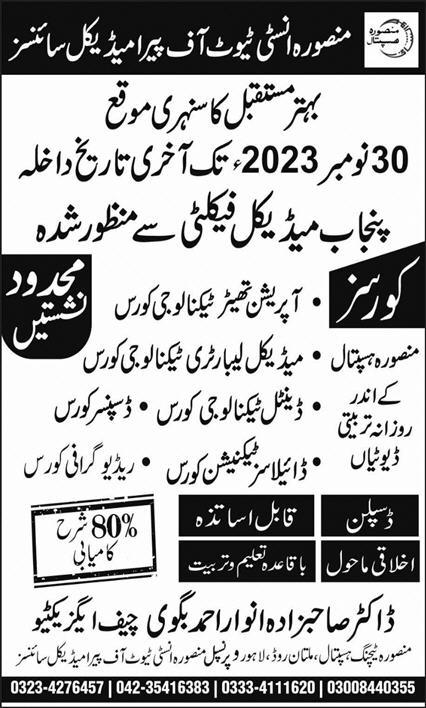 Mansoorah Institute of Paramedical Science, Mansoorah Hospital admissions 2023 for Diploma of Operations Theater Technology, Medical Laboratory Technology, Dental Technology, Dispenser, Dialysis Technician Course, Radiography Course has been announced. Students can enroll for admissions in Mansoorah Hospital Lahore Punjab Pakistan for academic year 2023 to continue campus based or online education in Medical Medical College. Eligible candidates for admissions in Diploma and Course can apply as per Government institute criteria and before closing date 30 November 2023 after reading advertisement online. Read newspaper ad for exact details.