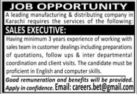 Manufacturing & Distributing Company jobs advertisement dated about 11 February 2024 in daily Jang Newspaper invites application for the vacant post of sales executive in Karachi, karachi Sindh Pakistan. Candidates with Bachelor etc. educational background will be preferred.